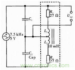 如圖1如果沒有C1和C2為普通半橋電路,虛線框中為電感傳感器的等效電路,傳感器測頭的位移帶動螺線管中鐵芯上下移動,從而改變上下兩個線圈的電感值。將兩線圈等效成純電阻和純電感的串聯(lián),如圖中R1和L1組成上線圈,R2和L2組成下線圈,輸出接在上線圈上。實(shí)際傳感器中線圈與輸出的接線不會變,只是通過鐵芯移動來改變電感,所以R1和R2固定不變。