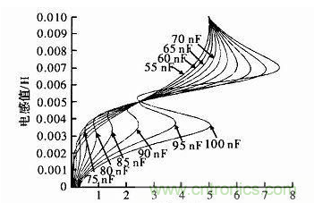 對于半橋時電路II由于希望鐵芯在最下方時回路II諧振,最上方時回路I諧振,因?yàn)長1和L2的變化范圍為3~7 mH。L2為7 mH時回路II諧振,L1為7 mH時回路I諧振。按照仿真條件計算C1=C2=65 nF。簡化仿真不妨取C1=C2,在65 nF附近從55~100 nF間隔5 nF進(jìn)行仿真,觀察電路性能,仿真結(jié)果如圖2所示。
