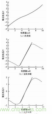 普通全橋在3.8~6.3 mH段,電壓變化范圍為-1.2~+1.3 V,電壓對電感的靈敏度為1 V/mH。線性度近似為1.38。對圖4(b)和圖4(c)使用Matlab進(jìn)行最小擬合直線如圖所示,在3.8~6.3 mH段,并聯(lián)方式輸出電壓的變化范圍為-2.66~+2.66V,靈敏度為2.130V/mH線性度可達(dá)1.68%。串聯(lián)方式的輸出電壓范圍約為-1.25~+1.25V,靈敏度約為2.130V/mH線性度可達(dá)1.33%。