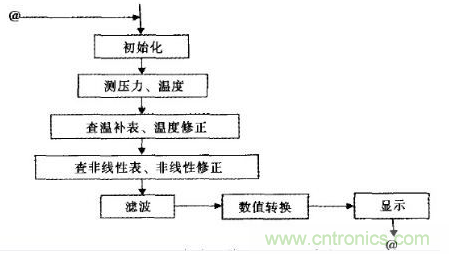 根據(jù)圖2的源程序流程圖可設(shè)計:安裝好智能壓力傳感器一進(jìn)行標(biāo)定一將信號轉(zhuǎn)換成數(shù)字碼一存人E.PROM中一理想輸出。如圖2所示。