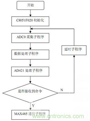 本系統(tǒng)采用C8051F020單片機為核心處理器件,把經(jīng)過調(diào)理電路處理的感應(yīng)式數(shù)字傳感器的電流信號經(jīng)模數(shù)轉(zhuǎn)換數(shù)字化,存入單片機內(nèi)部存儲器,并轉(zhuǎn)化為16位的數(shù)字信號,一路送AD421轉(zhuǎn)化為4~20 mA標準電流信號,進行傳輸或控制;另外一路通過MAX485,在上位機查詢命令到達的時候發(fā)送上位機,實現(xiàn)實時的監(jiān)控。本傳感器變送器系統(tǒng)軟件包括以下幾個部分:主程序、AD采集子程序、數(shù)據(jù)處理子程序、AD421轉(zhuǎn)化子程序、MAX485通信子程序,另外,根據(jù)需要可以加入報警子程序和其他的輔助程序等。整個系統(tǒng)如圖5所示。