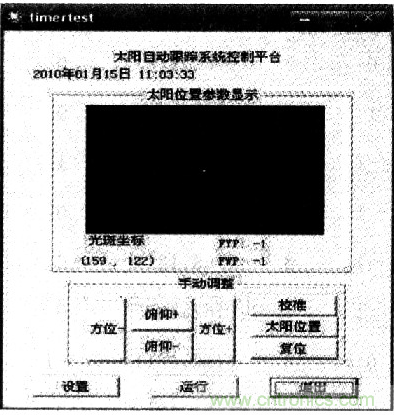 上位機(jī)可執(zhí)行程序控制界面如圖5所示,上位機(jī)控制平臺具有實(shí)現(xiàn)復(fù)位,太陽位置的跟蹤、手動(dòng)校準(zhǔn)。其中“設(shè)置”按鈕,可進(jìn)行波特率、調(diào)整時(shí)間間隔等的設(shè)置。