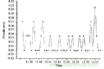 圖6和圖7給出了太陽高度角和方位角的誤差曲線。由曲線看出,采用基于圖像傳感器的太陽自動(dòng)跟蹤控制器后絕對誤差較小且保持相對穩(wěn)定。通過對實(shí)測數(shù)據(jù)的分析表明:在該系統(tǒng)中,高度角跟蹤絕對誤差小于0.12°,方位角跟蹤絕對誤差小于0.08°,采用圖像傳感器對太陽進(jìn)行跟蹤后,得到了很高的精度,且可靠性提高。