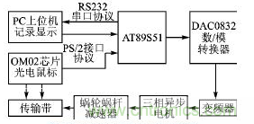 本系統(tǒng)采用全閉環(huán)控制方式,如下圖圖2,將鼠標檢測到位移增量反饋回單片機,并進行數(shù)字式PID控制,運算結(jié)果通過D/A轉(zhuǎn)換芯片傳給變頻器,從而控制電機的轉(zhuǎn)速。