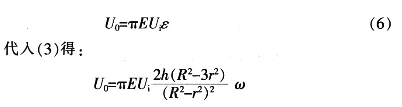 式中:μ為硅材料的泊松比,μ=O.35;R,r,h分別為硅膜片的有效半徑,計(jì)算半徑,厚度;E為硅材料的模量,E=8.7Gpa;P為作用于平膜片上的壓力;ω為平膜片的撓度;