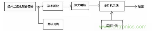 檢測電路由紅外二氧化碳傳感器、數(shù)字濾波電路、放大電路、穩(wěn)流電路、單片機(jī)系統(tǒng)、溫度補(bǔ)償?shù)冉M成。基本原理是紅外二氧化碳傳感器將檢測到的二氧化碳?xì)怏w濃度轉(zhuǎn)換成相應(yīng)的電信號,輸出的電信號分別經(jīng)過濾波、放大處理,輸入到單片機(jī)系統(tǒng),并經(jīng)溫度和氣壓補(bǔ)償?shù)忍幚砗?,由單片機(jī)系統(tǒng)輸出送顯示裝置顯示其測量值。