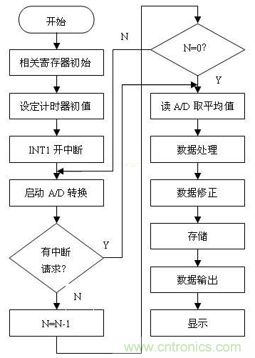 檢測處理程序流程框圖如圖4所示。采用MCS系列匯編語言〔5〕編程,由于有硬件設(shè)計的保證,使得整個系統(tǒng)既可以工作在循環(huán)查詢的方式,也可工作在中斷管理的方式。