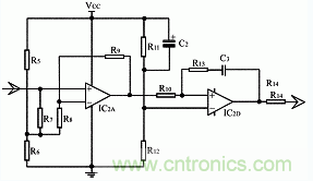 由D1、R15~R18、C6及IC 2C組成,由R18引入正反饋。當(dāng)前級信號頻率低于一定值F1時,IC 2C的8腳輸出低電平;當(dāng)前級信號頻率高于一定值F2時,IC 2C的8腳輸出高電平。臨界過渡區(qū)頻率范圍FW=F2-F1,適當(dāng)?shù)腇W可以有效防止檢測信號臨界過渡區(qū)的輸出振蕩,使得檢測動作可靠。