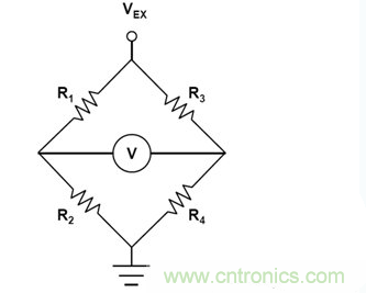圖1:受激勵(lì)電壓VEX和差分輸出電壓V驅(qū)動(dòng)的惠斯頓橋