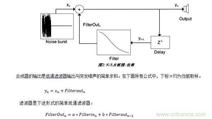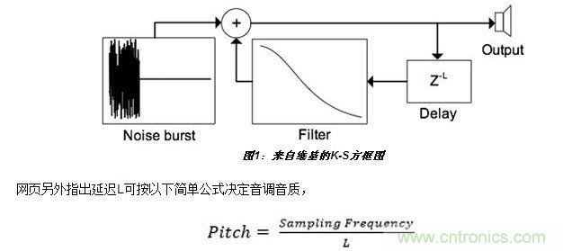 數(shù)字聲音合成技術(shù)總讓我這個業(yè)余愛好者感到著迷。一個有關(guān)Karplus-Strong吉他合成技術(shù)的維基網(wǎng)頁更加激發(fā)了我的興趣。它吸引我的地方是這種合成器設(shè)計非常簡單。下面是來自維基網(wǎng)頁的圖形(圖1):