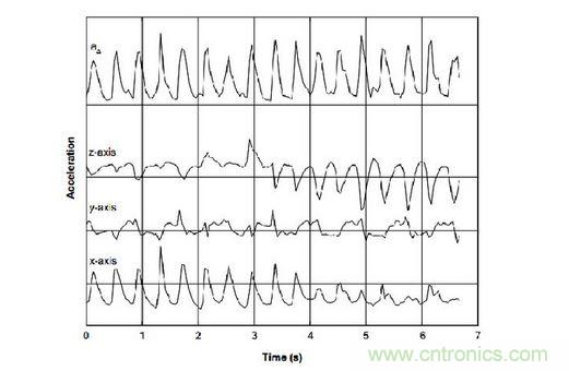 反映到圖表中,可以看到,在步行運(yùn)動中,垂直和前進(jìn)產(chǎn)生的加速度與時間大致為一個正弦曲線,而且在某點(diǎn)有一個峰值。其中,垂直方向的加速度變化最大,通過對軌跡的峰值進(jìn)行檢測計算和加速度閥值決策,即可實(shí)時計算用戶運(yùn)動的步數(shù),還可依此進(jìn)一步估算用戶步行距離。
