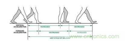 用戶在水平步行運(yùn)動中,垂直和前進(jìn)兩個加速度會呈現(xiàn)周期性變化,如圖所示。在步行收腳的動作中,由于重心向上單只腳觸地,垂直方向加速度是呈正向增加的趨勢,之后繼續(xù)向前,重心下移兩腳觸底,加速度相反。水平加速度在收腳時減小,在邁步時增加。