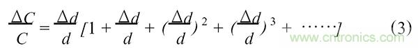 最后要說明的是關(guān)于非線性的問題。由下圖我們可以看到變間隙式電容傳感器相對輸出表達式為: