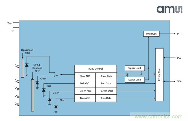 四個獨立的模擬數(shù)字轉(zhuǎn)換器(ADC)分別對應(yīng)一個RGB通道, C通道和紅外線通道共用第四個模擬數(shù)字轉(zhuǎn)換器。四個通道同時取樣能避免快速變化的光照條件下CCT和光照強度的測量出錯。TCS3490傳感器的光電二極管被安排在一個輻射狀結(jié)構(gòu)上,因此光線從任意方向射入都能獲得一致的有效響應(yīng),尤其是從圓形的窗口中射入的光。當光線測量值或顏色測量值超過預(yù)設(shè)的閾值時,傳感器會向處理器發(fā)送中斷信號,避免處理器不停地通過I2C接口輪詢,幫助降低整個系統(tǒng)的功耗,延長電池壽命。