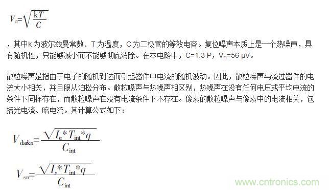 光電流散粒噪聲與照度有關(guān),很難消除。與暗電流有關(guān)的散粒噪聲可以通過改變摻雜濃度減小暗電流,但這會(huì)降低量子效率。在本電路中,In=100 fA,Is=20 pA,Tint=20 μs,C int =2 fF,則Vdarkn=0.28 mV,Vsn=4 mV。