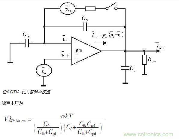 CTIA 讀出噪聲與輸入端電容Cin=Cpd、反饋電容Cfb,以及負(fù)載電容CL的設(shè)計(jì)均有關(guān),其小信號(hào)噪聲模型如圖4 所示。