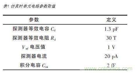 由于C1和C2的作用, 使得Cf在CTIA 反饋回路中的有效值減少,其有效值為:Cfb= ( C2Cf)/(Cf +C1+C2),這樣Cf可以取相對(duì)較大的值,避免了使用小電容,因?yàn)樾‰娙菰诠に嚿陷^難實(shí)現(xiàn),且誤差較大。在本電路中,Cf=20 fF,C2=18 fF,C1=150 fF,則Cfb=2 fF。