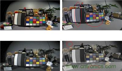 ASX34xAT系列在白天(典型情況為100-200lux明亮的光)和夜晚(典型情況為汽車倒車攝像頭在夜晚約10lux使用剎車燈和倒車燈)都較同類競爭器件提供更好的色彩飽和度和對比度,如圖2紅圈所示,在白天180lux的光照條件下,競爭器件采集到的圖像過度銳化,且色彩邊界有灰斑;在夜晚微光9.5lux的光照條件下,競爭器件采集到的圖像過度銳化,且有更多的噪聲。