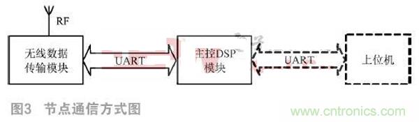 在傳感器網(wǎng)絡中,采用ZigBee通信協(xié)議時,節(jié)點被分為Coordinator、Router以及End Device三種。Coordinator負責系統(tǒng)的初始化工作,選擇網(wǎng)絡的信道等參數(shù)建立網(wǎng)絡,供其他節(jié)點加入;Router負責節(jié)點之間命令消息的路由轉發(fā)實現(xiàn);End Device負責任務是消息的發(fā)送和接收,只能和父節(jié)點進行數(shù)據(jù)通信,不具有路由轉發(fā)的功能。在本系統(tǒng)中,Sink節(jié)點主要負責監(jiān)控網(wǎng)絡的建立、上位機命令的分析處理和操作、數(shù)據(jù)的收集等任務,是整個網(wǎng)絡的數(shù)據(jù)存儲和處理中心,在上位機和監(jiān)控網(wǎng)絡之間起到橋梁的作用,是系統(tǒng)應用中的Coordinator。監(jiān)控網(wǎng)絡區(qū)域內(nèi)的待定位節(jié)點要具備消息轉發(fā)與路由其他節(jié)點的能力,需要可以給所有節(jié)點發(fā)送消息,也可以接收到所有節(jié)點的消息,是系統(tǒng)應用中的Router。每個節(jié)點由無線數(shù)據(jù)傳輸模塊和主控DSP模塊組成,同一節(jié)點的兩個模塊之間通過UART總線進行通信。節(jié)點之間通過無線RF射頻方式進行通信。Sink節(jié)點與上位機使用UART總線進行通信,未知節(jié)點的通信方式中并不包含該通信方式。節(jié)點的通信方式如圖3所示。