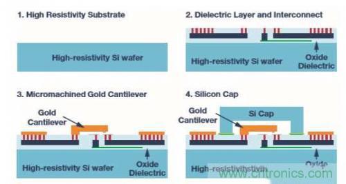 圖二中所示為利用MEMS技術制造開關的四個主要步驟。 該開關是以高電阻率的硅芯片(具有沈積在頂部的厚電介質層以提供與下方基板的優(yōu)越電氣隔離)所建構。 使用了標準的后端CMOS內部鏈接制程實現(xiàn)與MEMS開關的內部鏈接。 低電阻率金屬與多晶硅都被用來制作與MEMS開關的電氣鏈接,而且都被嵌入至電介質層當中。