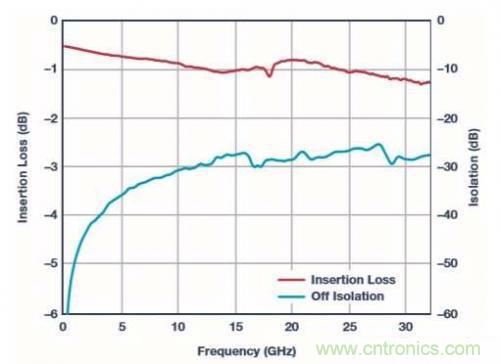 此基本的優(yōu)勢即可用來達成優(yōu)越的RF性能位準,再搭配上謹慎的設計。 圖五所示為針對原型QFN,單刀雙擲(SPDT)MEMS開關進行量測所得的插入損耗以及關閉隔離。 插入損耗在26.5 GHz下只有1 dB,而且在QFN封裝當中已經實現(xiàn)了超過32 GHz的帶寬。