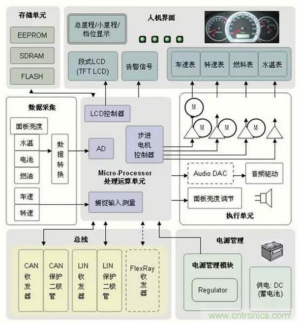 在汽車儀表系統(tǒng)中,各種儀表的傳感器的作用是將發(fā)動(dòng)機(jī)溫度、機(jī)油壓力、發(fā)動(dòng)機(jī)轉(zhuǎn)速、變速器輸出軸轉(zhuǎn)速、燃油箱油面的高低等物理參量轉(zhuǎn)換為相應(yīng)的電壓、電流或電脈沖。并驅(qū)動(dòng)相應(yīng)的儀表動(dòng)作,顯示相應(yīng)的被測(cè)量參量。當(dāng)測(cè)量值達(dá)到預(yù)設(shè)的極限值時(shí)就會(huì)使指示燈報(bào)警。