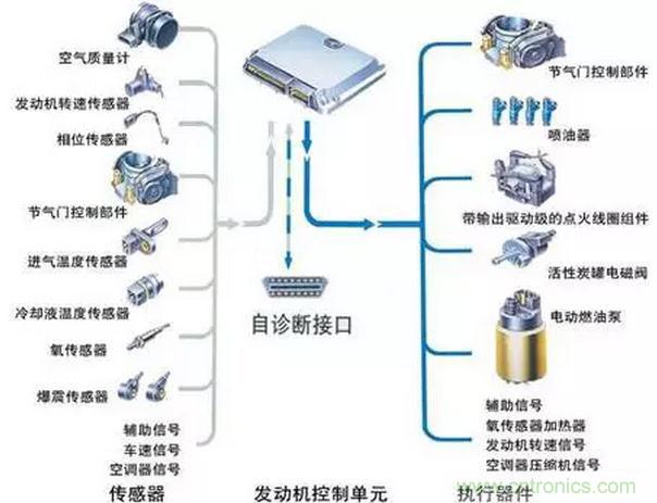 汽車電子控制系統(tǒng)有傳感器、電子控制器(ECU)和執(zhí)行器的組成。在汽車電子控制系統(tǒng)中,傳感器的作用是將被控對(duì)象的相關(guān)參量轉(zhuǎn)換為相應(yīng)的電信號(hào),并輸送給控制器,控制器根據(jù)相關(guān)傳感器的信號(hào)對(duì)被控對(duì)象的工況及狀態(tài)進(jìn)行分析與判斷后,輸出控制信號(hào),通過執(zhí)行器實(shí)現(xiàn)自動(dòng)控制。電子控制系統(tǒng)分為發(fā)動(dòng)機(jī)電子控制系統(tǒng)、底盤電子控制系統(tǒng)和車身電子控制系統(tǒng)。