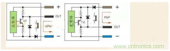 PNP型當(dāng)傳感器有檢測(cè)信號(hào)VT導(dǎo)通,正極的電流流向輸出端OUT,輸出端OUT電位接近正極,通常說的低電平翻轉(zhuǎn)成高電平。