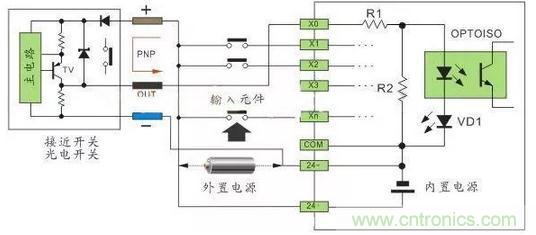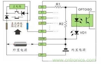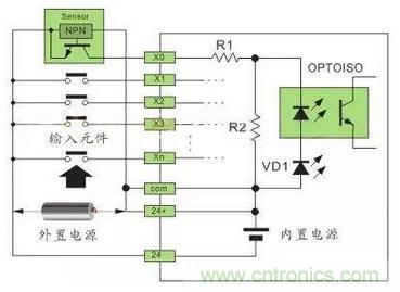注:24VDC供電的傳感器,在輸入回路上需要串聯(lián)限流電阻,R1為10Ω,R2為2KΩ,不串聯(lián)限流電阻,將燒毀接口回路,限流電阻取值2.7KΩ。