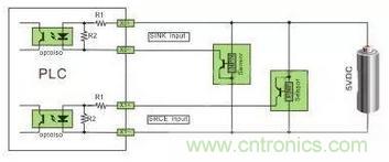 SOURCE源型為電流從輸入端流進(jìn),那么輸入端與電源正極相連即可,說明接口內(nèi)部的光電耦合器為單端共點(diǎn)為電源負(fù)極,可接PNP型傳感器。