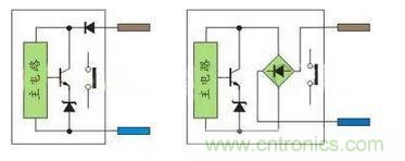直流兩線制接近開關(guān)分二極管極性保護(hù)與橋整流極性保護(hù),前者在接PLC時(shí)需要注意極性,后者就不需要注意極性。有源舌簧磁性開關(guān)主要用在汽缸上做位置檢測(cè),由于需要信號(hào)指示,內(nèi)部有雙向二極管回路,因此也不需要注意極性;交流兩線制接近開關(guān)就不需要注意極性。如圖10: