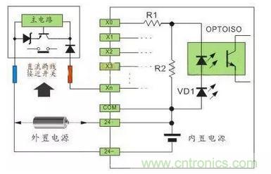 如圖1,直流輸入電路要求外部輸入信號(hào)的元件為無(wú)源的干接點(diǎn)或直流有源的無(wú)觸點(diǎn)開關(guān)接點(diǎn),當(dāng)外部輸入元件與電源正極導(dǎo)通,電流通過R1,光電耦合器內(nèi)部LED,VD1(接口指示)到COM端形成回路,光電耦合器內(nèi)部接收管接受外部元件導(dǎo)通的信號(hào),傳輸?shù)絻?nèi)部處理;這種由直流電提供電源的接口方式,叫直流輸入電路;