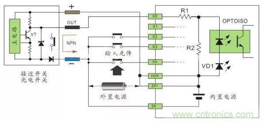 無(wú)源干接點(diǎn)比較簡(jiǎn)單,接線容易。不存在電源的極性,壓降等因素,上圖3-6中的輸入元件這是此類型。這里不重復(fù)介紹。