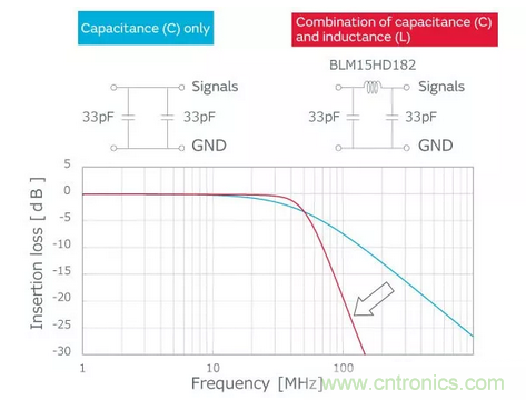 噪聲級(jí)別小或信號(hào)和噪聲的頻率相差大的情況下,可以只用電容器進(jìn)行降噪,但如果信號(hào)頻率和噪聲頻率相近時(shí),需要電感器和電容器組合來(lái)構(gòu)成插入損耗陡峭的濾波器。