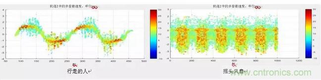 圖3:兩張圖顯示了行走的人和擺頭風(fēng)扇隨時間推移的微多普勒信息