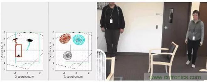 圖4:使用毫米波傳感器執(zhí)行分類的示例:中間圖上所有移動目標(biāo)都分配了一個軌道,彩色區(qū)域表示人