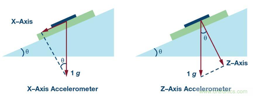 如下圖,坡度角θ。下圖左邊,檢測軸X軸垂直于重力平面(坡度為0時(shí)),此時(shí)加速度傳感器的輸出Ax=sin(θ)*1g。下圖右邊,檢測軸Z軸平行于重力平面(坡度為0時(shí)),此時(shí)加速度傳感器的輸出Az=cos(θ)*1g。