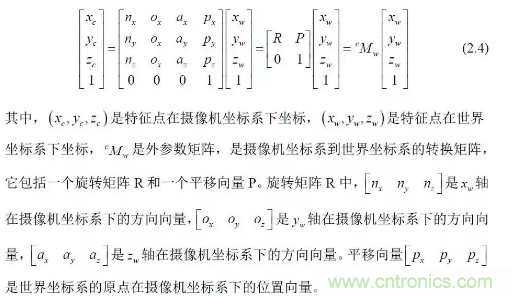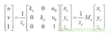 其中:(u,v)是特征點的圖像坐標,(u0,v0) 光軸中心的圖像坐標,(kx ky )是X 軸,Y 軸方向的放大系數(shù),(xc yc zc) 是特征點在攝像機坐標系下坐標, Mc 是攝像機內參數(shù)矩陣。