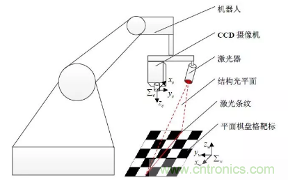 一個六自由度機器人,一個CCD 工業(yè)攝像機,一個激光器和一個平面棋盤格靶標。