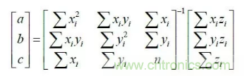 至此,得到四個激光條紋特征點的圖像坐標,由上式得四個激光條紋特征點在攝像機坐標系下的坐標,由于三點確定一個平面方程,使用最小二乘法計算結構光平面方程如下: