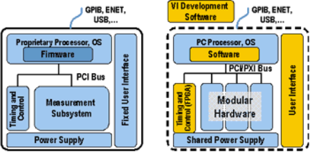 圖1、傳統(tǒng)儀器(左圖)和基于軟件的虛擬儀器(右圖)具有許多相同的結構組件,但是在體系結構原理上完全不同