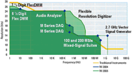 基本上,虛擬儀器系統(tǒng)是基于軟件的,所以如果只要是可以數(shù)字化的東西,就可以對它進行測量。因此,測量硬件可在通過兩根坐標軸進行評估,即分辨率(位)和頻率。參考下圖可以看出虛擬儀器硬件測量性能與傳統(tǒng)儀器的比較。NI的目標就是將曲線在頻率和分辨率上延伸并且在曲線內進行不斷推陳出新。