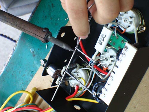 元件鍍錫----在刮凈的引線上鍍錫??蓪⒁€蘸一下松香酒精溶液后,將帶錫的熱烙鐵頭壓在引線上,并轉(zhuǎn)動(dòng)引線。即可使引線均勻地鍍上一層很薄的錫層。導(dǎo)線焊接前,應(yīng)將絕緣外皮剝?nèi)?,再?jīng)過(guò)上面兩項(xiàng)處理,才能正式焊接。若是多股金屬絲的導(dǎo)線,打光后應(yīng)先擰在一起,然后再鍍錫。