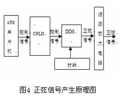 采用DDS技術(shù)在當(dāng)前的測(cè)試測(cè)量行業(yè)已是一種主流的做法,其頻率精度可隨相位累加器的位數(shù)而定。本系統(tǒng)采用單片機(jī)+專(zhuān)用DDS芯片的方式產(chǎn)生正弦信號(hào),其原理如圖4所示,ARM單片機(jī)向CPLD 發(fā)出控制命令,CPLD 在時(shí)鐘下譯碼后產(chǎn)生DDS的控制信號(hào),產(chǎn)生出相應(yīng)頻率的正弦波信號(hào),該正弦信號(hào)經(jīng)過(guò)濾波放大后,輸出相應(yīng)幅值的正弦信號(hào)。