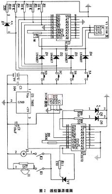 手持遙控器原理如圖2所示。電路由發(fā)射和接收報警電路組成,發(fā)射電路由發(fā)射模塊V1、編碼芯片U1組成。U1即SC2262的1-8腳為三態(tài)地址編碼,這里我們將SC2262的7腳接地,同樣車載報警裝置的接收電路的解碼芯片SC2262也設(shè)置成7腳接地,否則不能解碼;接收電路由接收模塊V2和解碼芯片U2即SC2272組成,這里我們將SC2272的1-8腳三態(tài)地址編碼設(shè)置為1、2、7腳接地。對應(yīng)的車載報警裝置的發(fā)射電路也將三態(tài)地址編碼設(shè)為l、2、7腳接地。報警電路由震動器J2,蜂嗚器兒和D5、D6兩個不同顏色的LED組成。電源分別有9 V和5 V。將9 V直接供給發(fā)射電路,再將9 V經(jīng)7805降到5 V供給接收電路和報警電路。