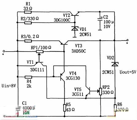 當(dāng)輸出電壓增大時,三極管VT5基極偏壓減小,其集電極電流減小,電壓升高,從而引起三極管VT4基極電壓升高,電流減小,其發(fā)射極(即調(diào)整管VT3基極)電壓升高,電流減小,VT3管壓降Uce3增大,這樣就使輸出電壓降低,達到穩(wěn)壓的目的。輸出電壓可以通過調(diào)節(jié)電位器RP2加以改變。